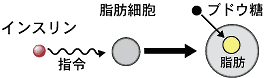 インスリンは、血液中にブドウ糖が多くなると、余分なブドウ糖を血中から除くように全身の細胞へ指令するために分泌されます。この指令によって、まず肝臓細胞がブドウ糖をグリコーゲンに変えて蓄えます。次に筋肉細胞がブドウ糖をグリコーゲンに変え、自ら使用する食糧として蓄えます。しかし、これらの収納スペースは限られていて、余ってしまったブドウ糖は際限のない収納スペースをもつ脂肪細胞が一手に引き受けます。ブドウ糖を脂肪に変えて溜めこむのです。こうしてめでたく血糖値は下げられますが、いつも過大に血糖値を上げ続けると、体脂肪は際限なく増加していくのです。