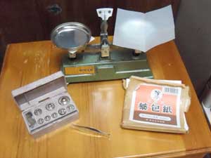 粉末状の染料や薬品を量る際に使用します 近年は電子秤も使用されますが、天秤ばかりの方が扱いやすく長く使用できます 使用する前に必ず目盛りが中央に静止しているかを確認し、もし左右にぶれていたら受け皿の下のネジで調節します 受け皿は、左側に分銅、右側に染料や薬品を盛ります 分銅の受け皿の下に薬包紙を畳んで置き、右側の受け皿の上に薬包紙を置いて天秤の目盛りを合わせます